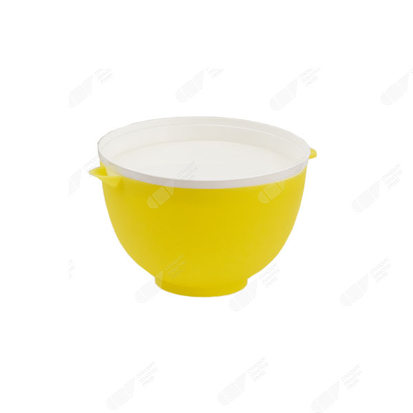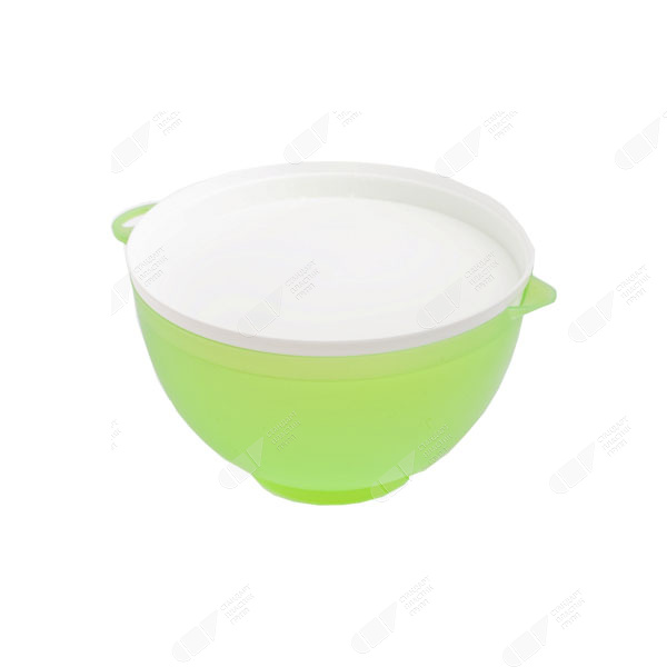 Пластиковая емкость с крышкой позволяет хранить продукты, а также сливать из них лишнюю жидкость.